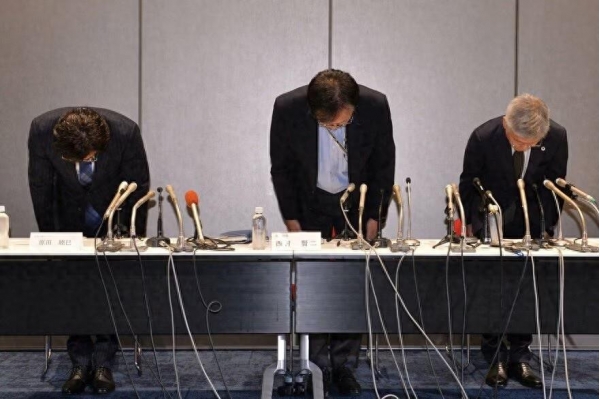 在记者招待会上低头(左起)的日本代表教练原田睦巳、体操协会西村贤二专务理事、藤田直志会长