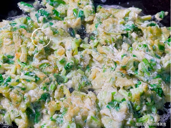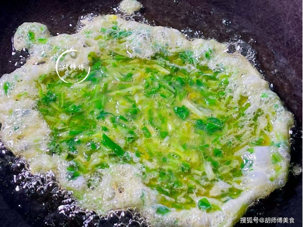 第四步:锅中放入适量油,等油温烧到5成热后,将马兰头鸡蛋液放入锅中,大火将一面煎的要定型时,在慢慢翻动鸡蛋液。