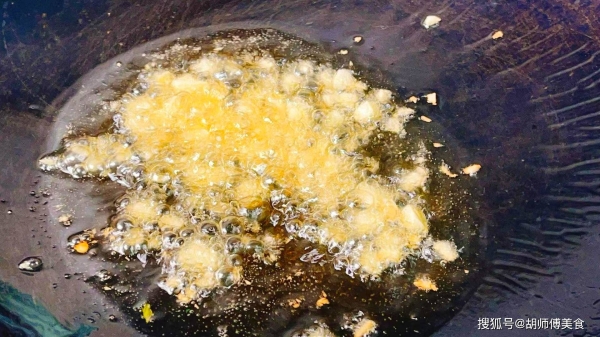 第二步:锅中放入一勺油,等油烧热后,把切好的大蒜末放入锅中,大火将大蒜末炸10秒,彻底激发出大蒜末的香味。