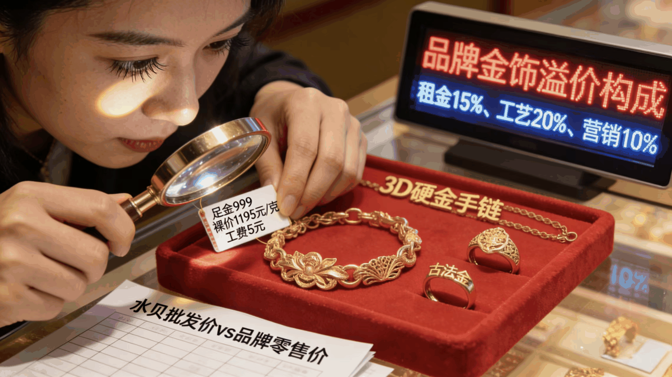 金条,投资品,价格跟着金价走,溢价少,大概1%到3%,标准化产品,没有品牌溢价,没有工艺成本,想卖也容易,按金价回收,方便的很,金饰就不一样了,消费品,包含了品牌,工艺,租金,营销,各种成本,15%到25%,钱都花在这里了,溢价高,什么3D硬金,古法金,工艺费高的吓人,回收的时候,只看黄金纯度,重量,品牌,工艺,一分钱不值,亏大了,很多人不懂。