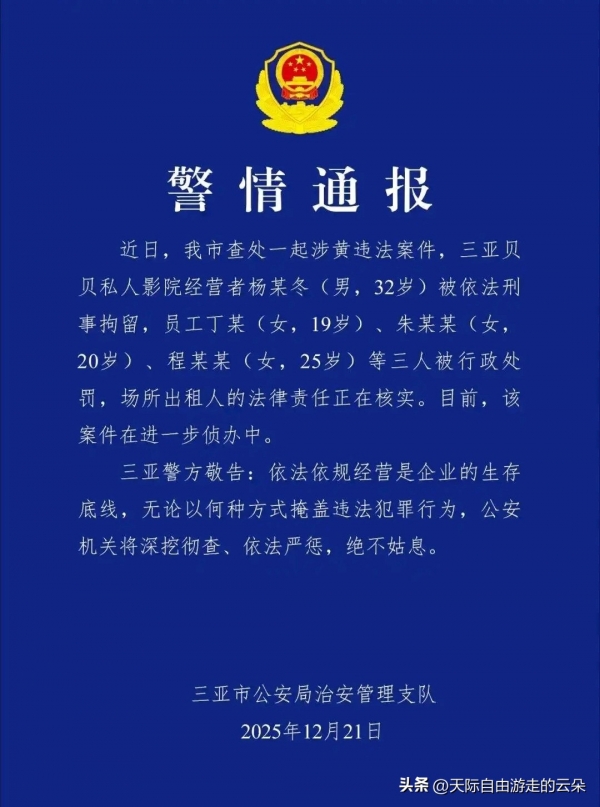 12月21日,三亚市公安局治安管理大队通报一起涉黄违法案件,引发广泛关注。据警方消息,三亚"贝贝私人影院"经营者杨某冬(男,32岁)因涉嫌组织卖淫嫖娼被依法刑事拘留,店内3名员工丁某(女,19岁)、朱某某(女,20岁)、程某某(女,25岁)因参与违法行为被行政处罚。