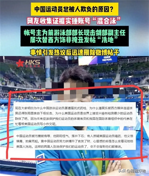 就在这时,一个名为"混合泳"的社交账号,进入了人们的视线,这个账号的使用者,被网友扒出是前国家游泳队某位领导"袁某",而他过往在网络上发表的一些言论,更是让人们感到无比震惊和愤怒