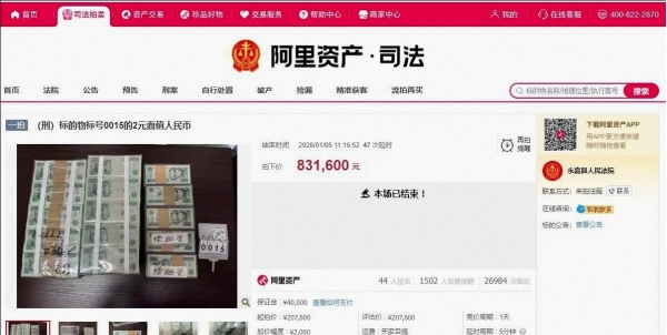 面值只有2.1万元的一批第四套2元纸币,在公开司法拍卖里被人以83.16万元拿下