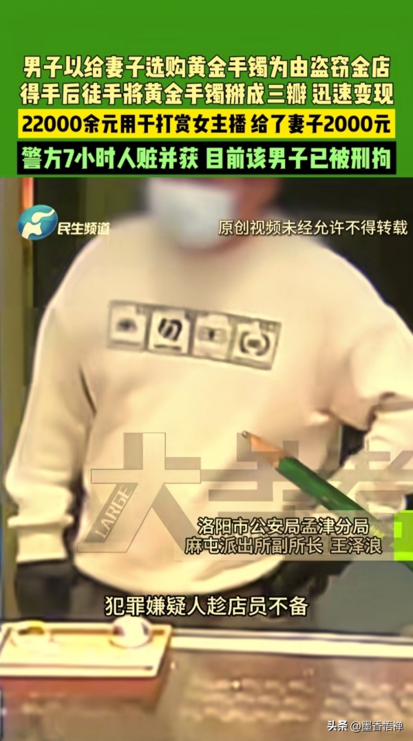 经过审讯得知,男子怕被追查到,就把几个手镯全部掰开,找了几个地方分开卖了,一共卖了29000元,其中的22000多元打赏给了女主播,给自己的妻子转了2000块钱,给自己买了一部1500块钱的手机。
