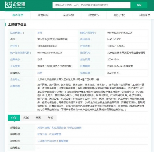 萝卜快跑关联公司为萝卜运力(北京)科技有限公司。据企查猫显示,萝卜运力(北京)科技有限公司成立于2020年12月月14日,法定代表人为毕然,注册资本1000万人民币,公司经营范围包括:技术开发、技术服务、技术转让、技术咨询、技术交流、技术推广、技术检测;软件开发;基础软件服务;应用软件服务;计算机系统服务;互联网数据服务(互联网数据服务中的数据中心,PUE值在1.4以上的云计算数据中心除外);信息处理和存储支持服务(信息处理和存储支持服务中的数据中心,PUE值在1.4以上的云计算数据中心除外)等。
