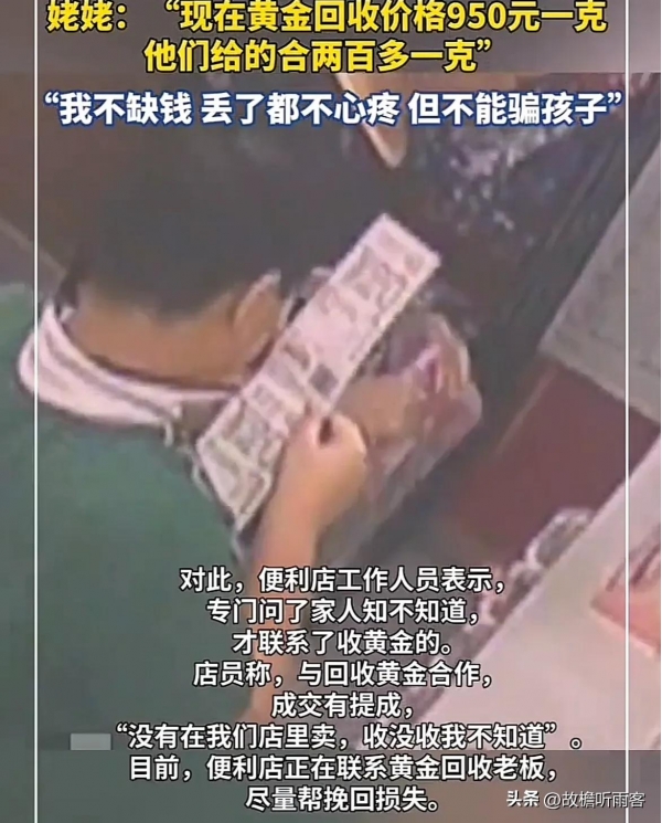 涉事便利店工作人员事后辩称,他们在联系回收商前曾询问男孩"家人知不知情",男孩口头回答"知道",于是便协助完成了交易。同时该员工承认,店内与黄金回收存在合作关系,每促成一笔交易可获得提成。然而,对于如此大额且涉及未成年人的财产处置,既无身份核实,也未要求监护人到场或提供书面同意,整个流程形同虚设。