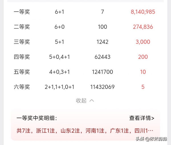 本期一等奖中出7注,每注奖金814万,二等奖100注,每注奖金27.4万,奖池累计28.4亿。