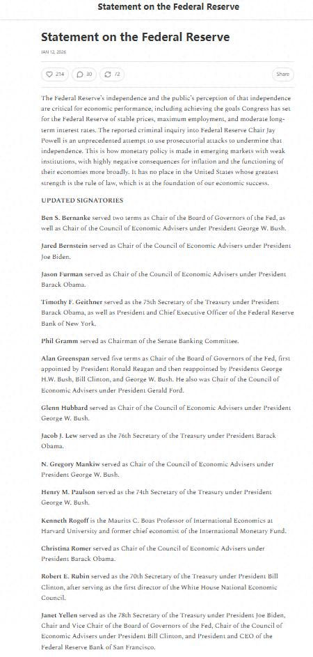 他们共同签署了一份联合声明,以声援鲍威尔。他们写道:"有关对美联储主席鲍威尔展开刑事调查的报道,是试图通过检察手段破坏央行独立性的前所未有之举。"