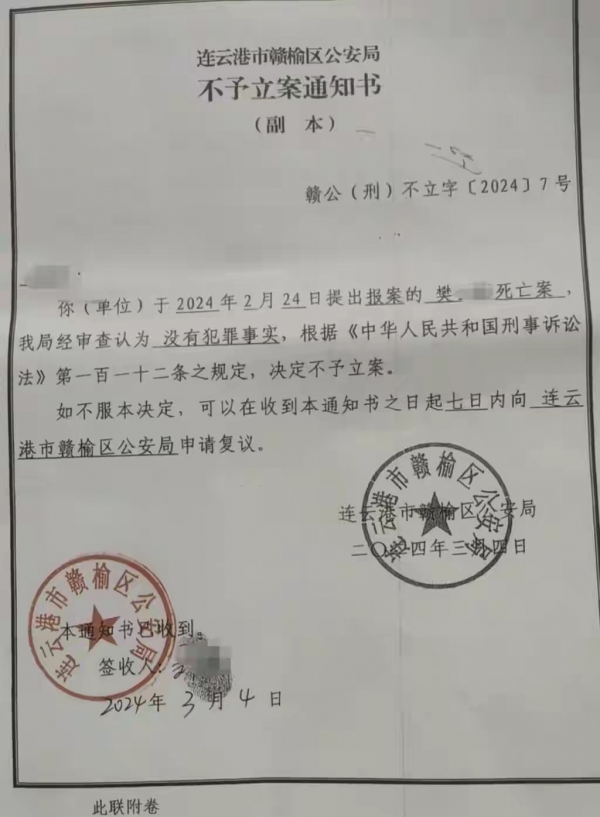 樊旭声接到通知赶到殡仪馆时,法医初步判断其女死因与酒精过量有关。悲痛之余,他当即提出尸检请求,但未获明确回应。数日后,警方告知他,在樊蕊体内提取物中检出了老板刘某的精液。赣榆区公安局经过初查,于2024年3月4日出具《不予立案通知书》,认为"没有犯罪事实"。官方给出的解释是,刘某与樊蕊系情人关系。不久,赣榆区纪委对5名违规接受宴请的镇干部分别作出党内警告处分及诫勉谈话的处理。樊旭声一家在与刘某达成协议后,领取了总计235万元的赔偿款,樊蕊的尸体也被火化。事情似乎就此画上句号。