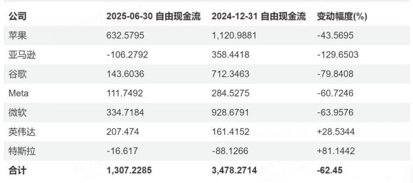 截至2025年第二季度,"七巨头"的自由现金流总额已较2024年年底下降了62.45%。