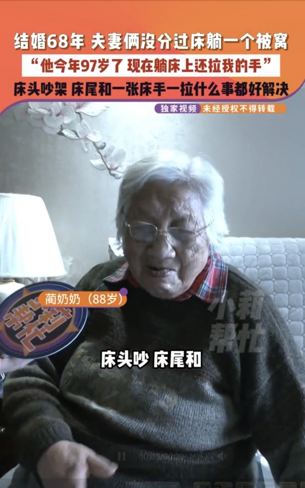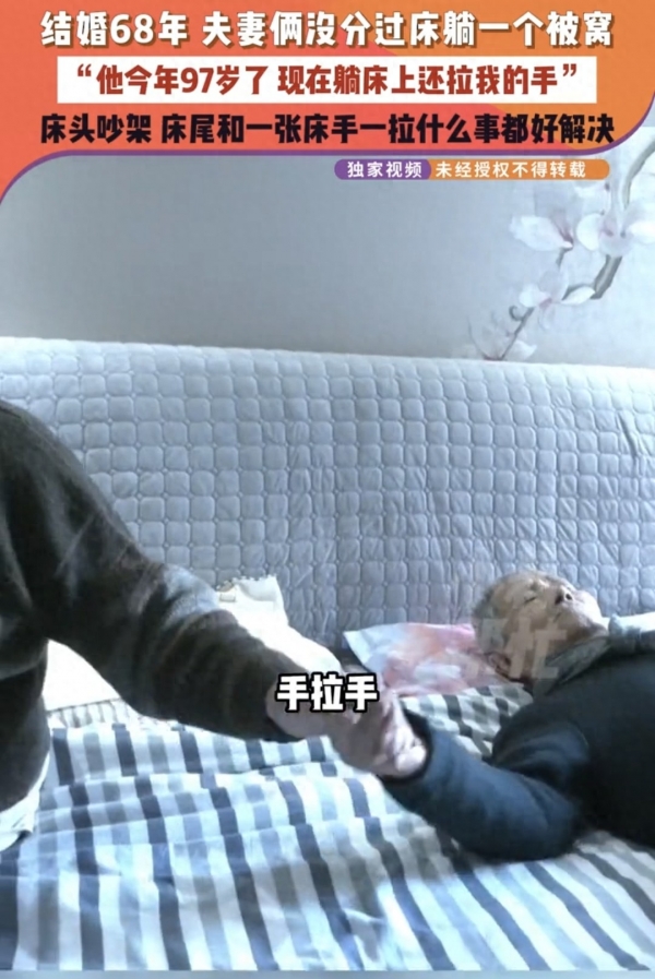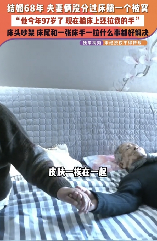日常相处中,二老满是温情细节:结婚数十载从未分床,一直同盖一床被窝;即便丈夫年事已高卧床,也时常会拉着蔺奶奶的手,蔺奶奶从不厌烦,始终温柔配合;两人偶有争执,也秉持"床头吵架床尾和"的理念,生气从不过夜,很快便能和好如初。