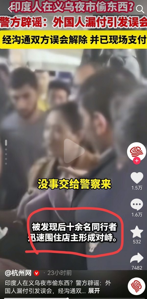 根据媒体11月23日的报道,就在近日,浙江金华有网友发布视频表示,"有印度人在义乌店铺偷衣服",从公开的视频显示,有一名女子提着衣服,对着几名印度人进行斥责,然后在她的四周,还围满了一群印度人。