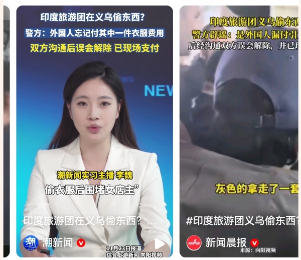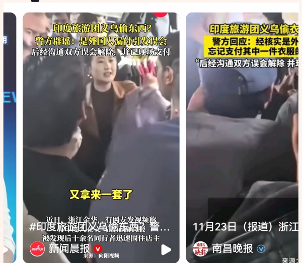 事件还要从11月21日说起,有几名印度游客在义乌夜市逛街,在经过一家服装店时,进入选购衣服,结果被女店主指责偷衣服,说对方拿走了灰色和紫色两套衣服。