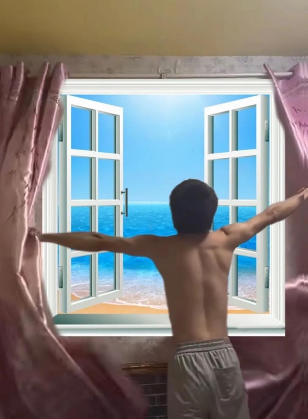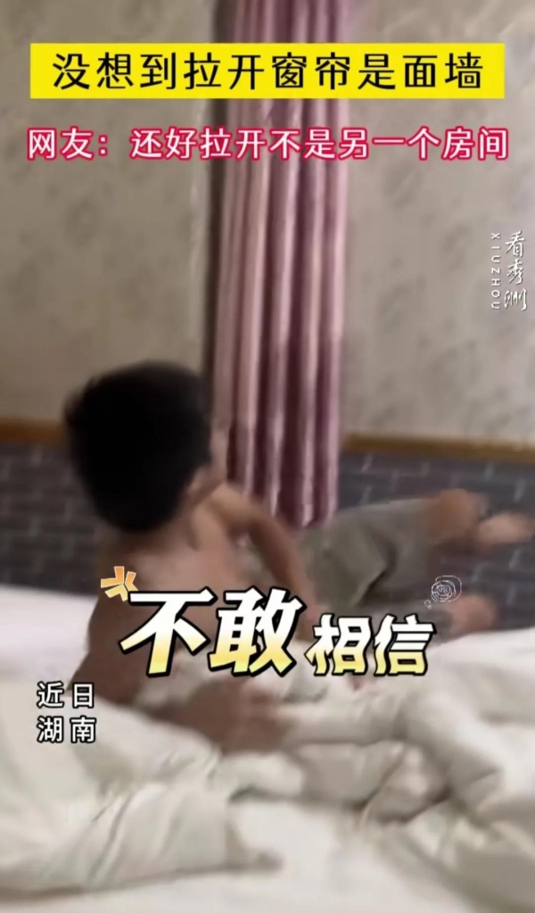 可是当第二天早上醒来想打开窗户去透透气的时候,发现窗帘拉开后结果是一面大白墙,他们整个人都笑不活了,男子更是小的前俯后仰摊在床上。