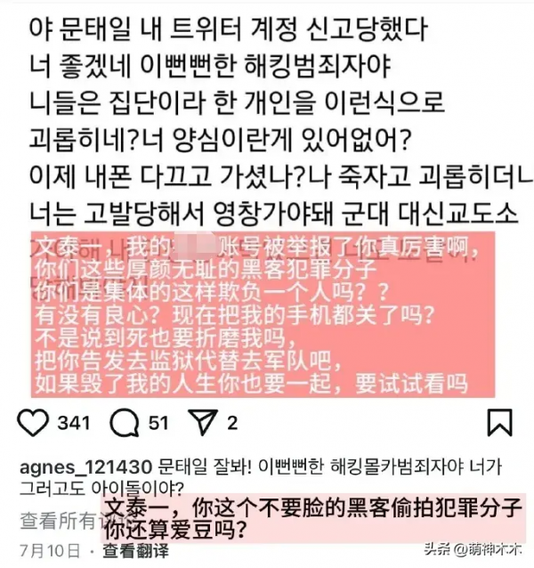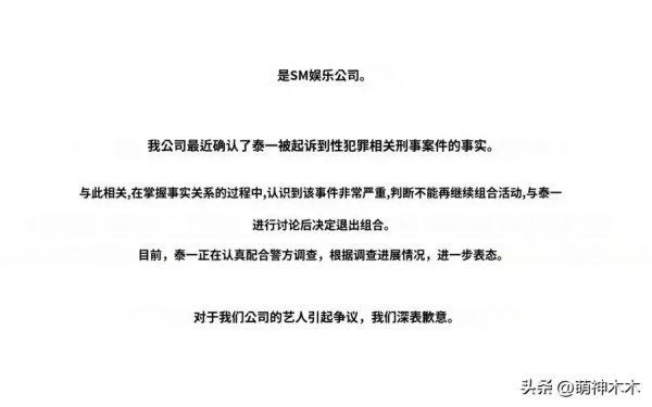 当然,这些都没有实锤,无法确定文泰一是否涉及强奸女童,不过,既然一向被粉丝调侃艺人可以养老的SM都如此决绝,不带一点犹豫地让文泰一退团,甚至和他一起并肩作战的成员们都火速取关割席,说明文泰一干的事儿已经触及了公司的底线和利益,令其无法再合作只能公开割席。