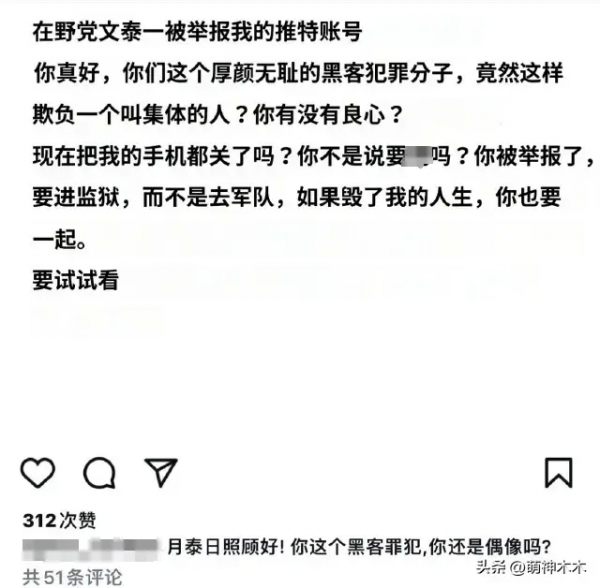 之前的睡粉相比起来不足为提,文泰一被指控性暴力让事态全面升级,有人通过外网相关报道爆料,文泰一疑似涉嫌强奸、轮奸、恐吓性暴力、强制猥亵,而早在五月份,就有人匿名上传帖子爆料,还疯狂在文泰一的社交平台下喊话,当时本以为只是黑粉的恶意攻击,可结合官方的通告让人细思极恐,没想到人不可貌相,割裂感太强了。