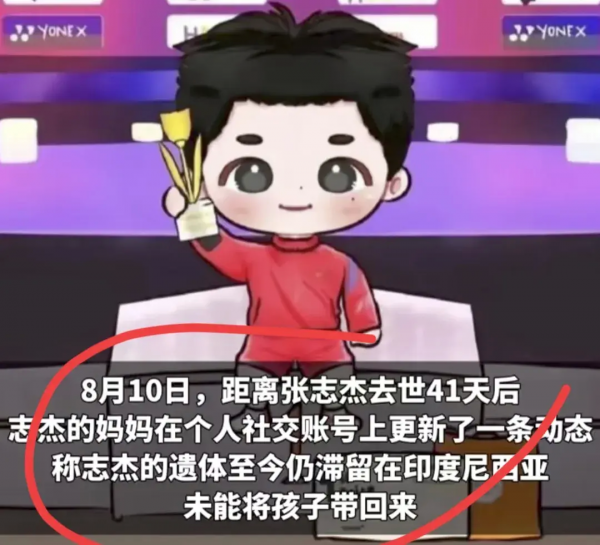 国羽小将张志杰于6月30日在印度尼西亚参加比赛时突然晕倒,经抢救无效去世。8月10日,其母发文称,儿子的遗体仍滞留在印尼。8月12日,中国羽协就此事回应:有专门部门在负责,具体情况请关注官方公告。