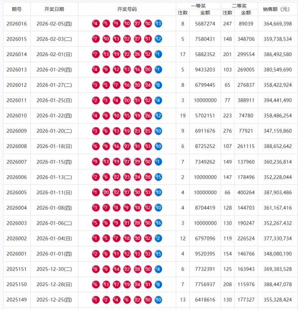 双色球第2026016期开奖号码:04、05、09、10、27、30+13