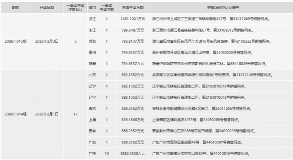 河北1注,浙江1注,安徽1注,山东1注,河南2注,四川1注,深圳1注,共8注。