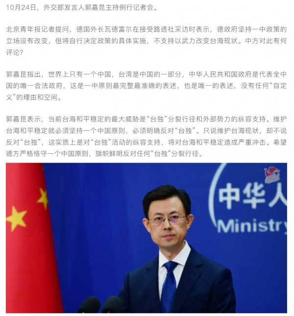 德国外长瓦德富尔的原话是,公开批评中国"支持俄罗斯侵乌、破坏世界秩序、容忍朝鲜逃避制裁、在南海无视国际法"。