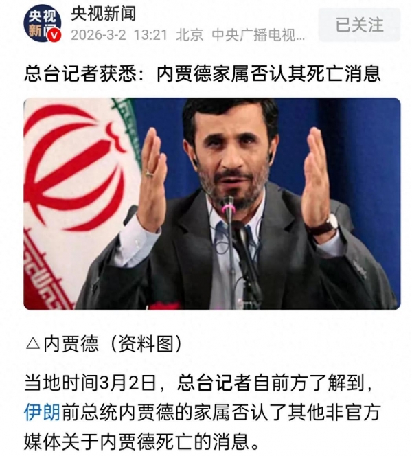 但是在3月2日,央视总台记者在前方(或为伊朗首都)了解到内贾德的家属否认了非官方媒体所讲的内贾德已经死亡的消息。之所以说是非官方媒体所讲的消息。是因为伊朗官方并没有宣布内贾德身亡的消息。伊朗劳动新闻通讯社(ILNA)最初援引知情人士报道称内贾德住所遭袭,内贾德本人和保镖均遇害。但稍后又更正称尚无法证实,所以目前尚无伊朗官方确认此消息。