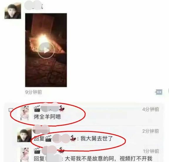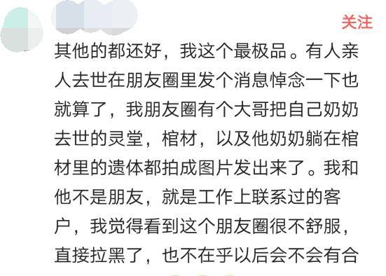 之前我朋友圈有个人她姥姥去世了 ,朋友圈整整刷了3天, 从搭灵堂开始 ,然后是鬼头念那一堆话到亲戚朋友来吊念, 最后一天直接从起灵一直到火葬场加仪式,刷了得有20个小视频, 还有家人嗷嗷哭的, 我寻思着, 这节奏下一步不就该直播火化你姥姥了, 果断直接拉黑。