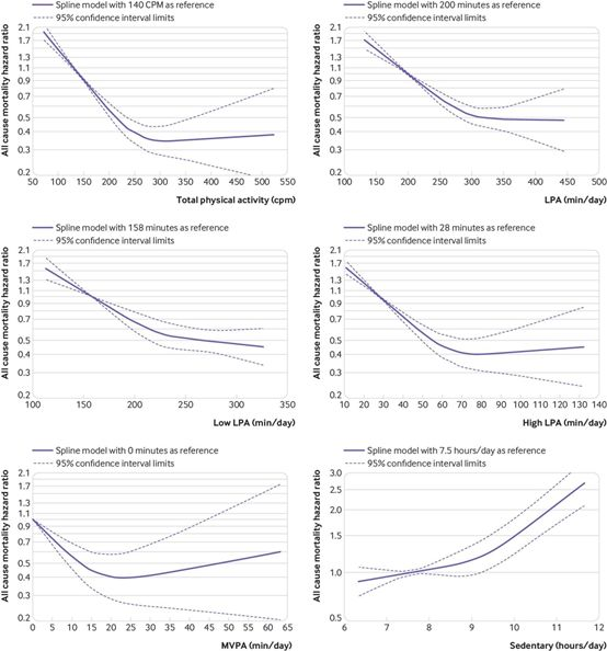 该研究纳入36383名平均年龄在62.6岁的受试者数据,结果发现,每天进行至少6.25小时的轻体力活动,或者进行至少24分钟中高强度体力活动的人,与很少或者基本不进行体力活动的人相比,死亡风险降低50%-60%。