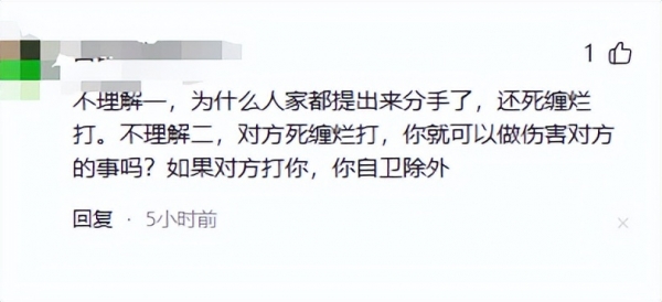 还有网友评论道:不理解,为什么人家都提出来分手了,还死缠烂打。不理解二,对方死缠烂打,你就可以做伤害对方的事吗?如果对方打你,你自卫除外