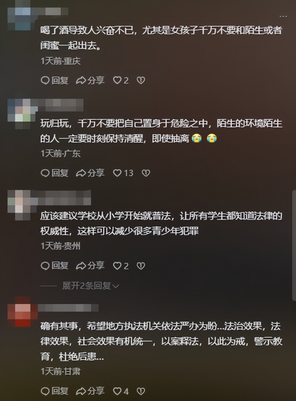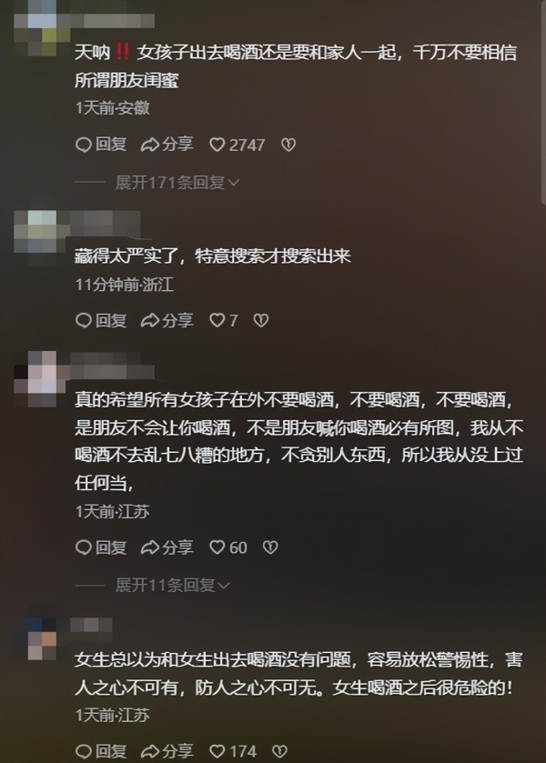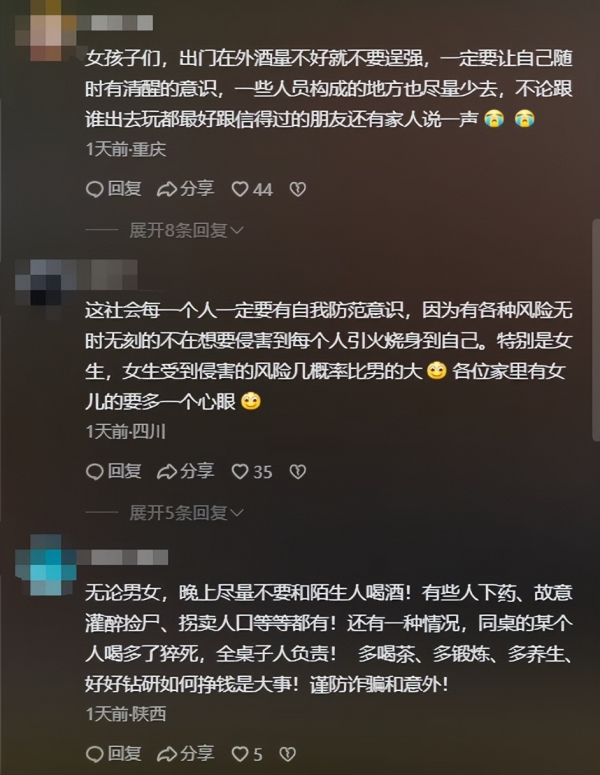 网友说:女生一定要保护好自己啊,这是比爱情还要永恒的主题,就是平安!