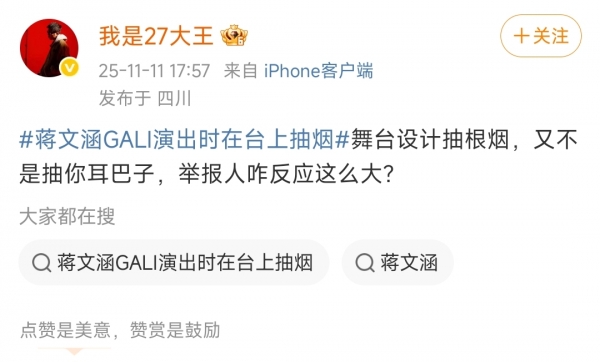 一些年轻的粉丝,觉得GALI在舞台上吸烟"很酷",是表演设计的一部分,是艺术表达的延伸,不必过度解读。