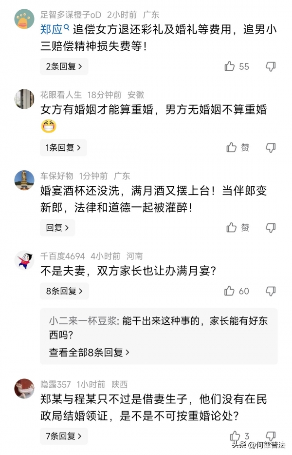 不少网友分析:郑某某与程某只不过是借妻生子,他们没有在民政局结婚领证,是不是不可按重婚论处?