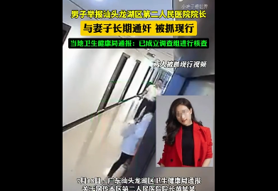 近日,汕头龙湖区,一医院院长和一名女子开房被女子丈夫现场抓住,视频显示,院长和女子被发现后表现慌乱,女子的形象也一同崩塌。发到网络引起全网热议,目前有关部门已经成立调查组在调查中。