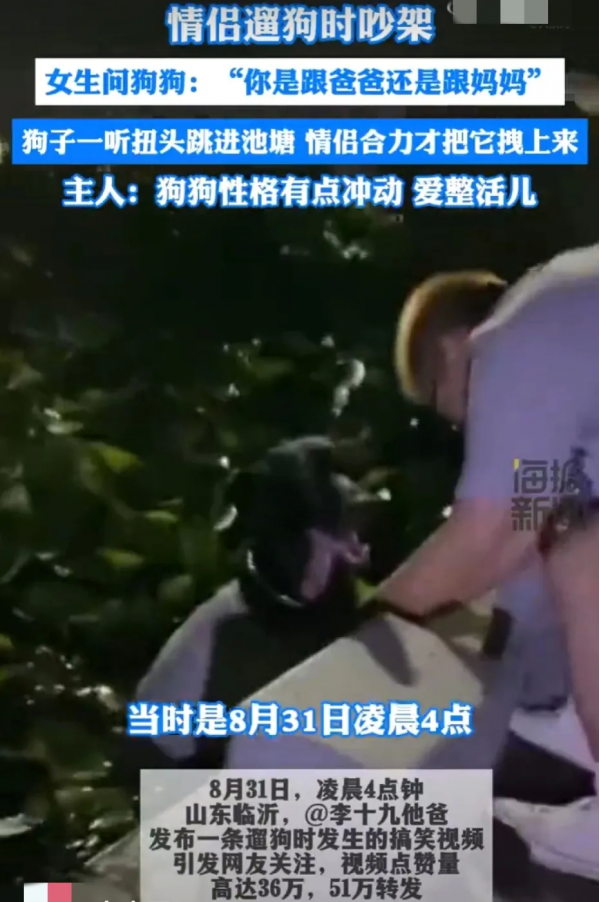 8月31日,山东临沂,凌晨4点,一对情侣在遛狗时吵架,女生问狗狗:"你是跟爸爸还是跟妈妈?"狗狗一听就跳进了池塘,拉都拉不上来[允悲]狗主人说,狗狗性格随他俩,有点儿冲动,爱整活儿