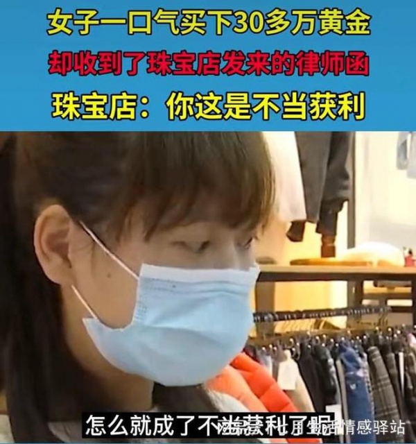 刘女士媒体说:"还没有见过这么不要脸的,黄金降价的时候我按珠宝店里标的价格购买了30万黄金,现在市场价涨回来,珠宝店竟然觉得自己亏了,给我发了律师函要我返还差价十几万!还有这样做生意的吗?那黄金价高的时候我买了的话,现在要是价格降下来了,珠宝店是不是得还我十几万啊?"