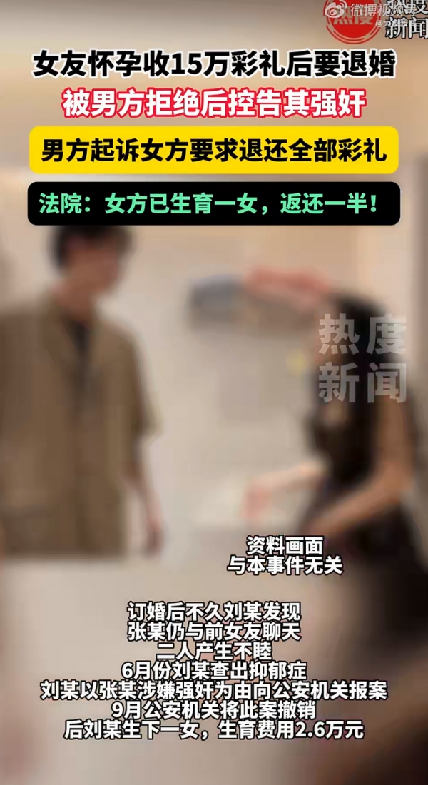 男方觉得自己太冤了,借了15万彩礼,婚没结成,还被诬告强奸,现在还得养孩子。于是他就把女方告上法院,要求返还15万彩礼。女方也有自己的理由,她说自己生了孩子,还独自抚养了好几个月,而且男方跟前女友联系是男方有过错,导致自己抑郁,所以不同意退还彩礼,还要求男方每个月给1500块的抚养费。