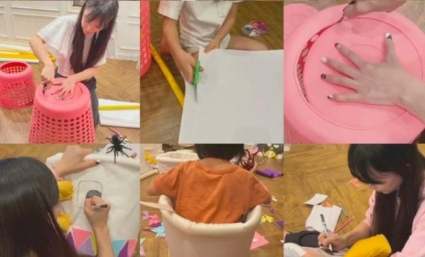 生日刚过没多久,李靓蕾就在社交账号上发了照片,又是三个孩子做的一堆手工。