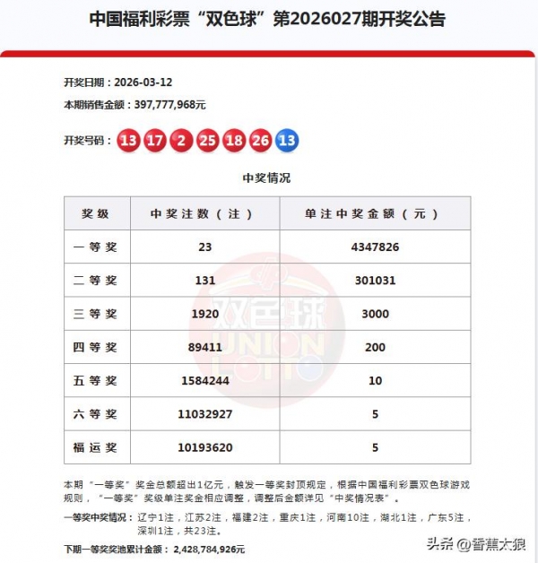 大家好!今天是3月12日,星期四,双色球26027期开奖号码公布了,本期双色球开出的号码为红球:2、13、17、18、25、26蓝球:13。红球开出了2组连号,0组同尾号和2枚重号。