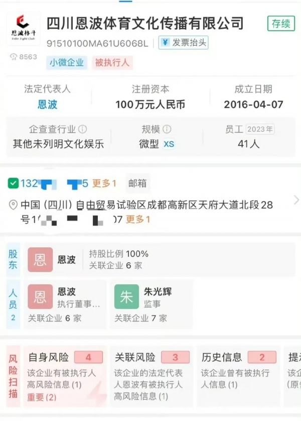 而据报道,恩波格斗俱乐部关联公司四川恩波体育文化传播有限公司涉多起司法案件,案由包括买卖合同纠纷等。该公司法定代表人、全资股东恩波于10月成为被执行人,执行标的72.5万元,于11月冻结所持有的100万元股权,并被法院限制高消费。