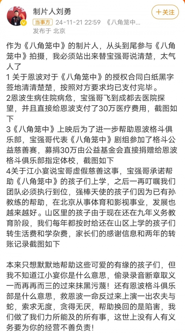 随后《八角笼中》制片人刘勇发文力挺王宝强,详细列举了事实:不仅已按合同支付恩波俱乐部要求金额,在恩波生病住院时,王宝强还亲赴医院探望并支付 30 万元医疗费用。