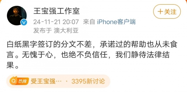 对于此事,王宝强工作室迅速发布声明回应,称所有合同均按约定支付,"白纸黑字签订的分文不差,承诺过的帮助也从未食言。无愧于心,也绝不负信任,静待法律结果。"