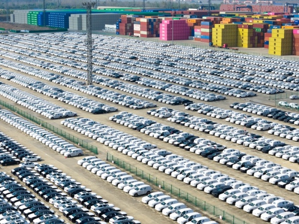 11月12日,江苏港口集团南京港龙潭港区集装箱码头上,等候装船远销的新能源汽车。 IC Photo