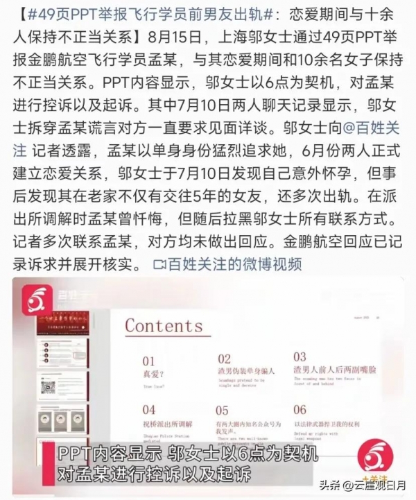 8月15日,一则长达49页的ppt实名举报信在朋友圈疯传。上海邬女士以图文并茂的形式描述,金鹏航空公司飞行学员孟某在恋爱期间与十几名女学生保持不正当男女关系。随举报信一起放出的三段调解电话录音,将这一事件推向高潮。