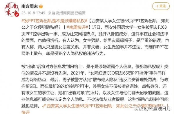 "PPT上有他自己的名字、单位、照片,包括一些聊天记录,所有这些都是个人私密的东西",一位法律专家指出,"这些内容属于公民个人的隐私范围,未经他人同意擅自披露,便涉嫌侵权(《民法典》)"。