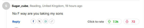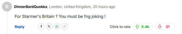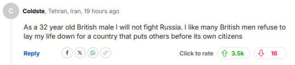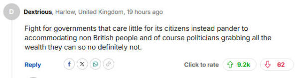 最高赞写道:"为那些漠视公民的政府、贪婪的政客和非英国人而战,绝对不行。"