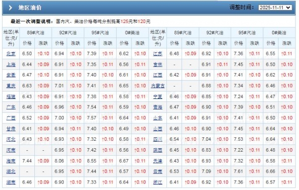 据了解,上周初(11月10日),下半年第10次调价,11月首次调整,汽柴油结束了此前4个月单边下降的走势,继7月1日汽柴油"3连涨"后,成品油恢复上涨!此次油价反弹,汽油上涨125元,柴油上涨120元/吨,换算各地加油站92/95号汽油,油价普遍涨价0.1元和0.11元/升,按照私家车50升容积,加满一箱油,相比10月末估计多花5~5.5块钱!目前,北京市场,92号汽油报价在6.94元/升,山东92汽油报价在6.91元,主流95号汽油报价在7.4元/升左右,具体各种汇总报价参考文末配图!