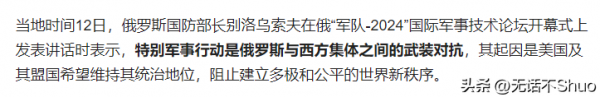 俄罗斯国防部长也提到:这次军事行动是对于西方集体的武装对抗,也是对于乌克兰不自量力行为的证明。