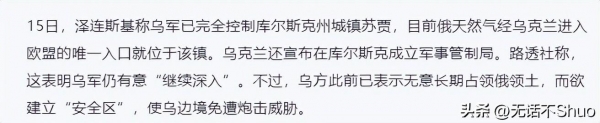 乌军还自称完全控制了库尔斯克州的城镇苏贾,但表示并没有占领的意思,只是为他们建立所谓的"安全区",企图围魏救赵,用俄罗斯地区的土地来换取乌克兰边境的安全。
