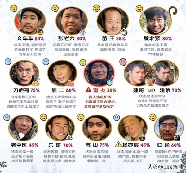 这场荒野求生赛的参赛阵容涵盖了不同年龄与职业背景的 14 人。其中既有户外经验丰富的博主 "蜜蜂哥",也有来自普通职场的 "张老六""老中医",年龄跨度从 20 多岁延伸至 40 岁以上。他们带着各自的初心踏入七星山荒野,没有现成的庇护所,没有充足的补给,只能依靠自然赋予的资源与自身技能求生。