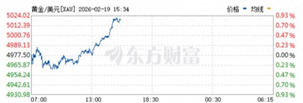 受地缘政治紧张等多因素驱动,2月19日,现货黄金再次站上5000美元/盎司,日内涨超0.80%,现货白银日内涨超2.5%。