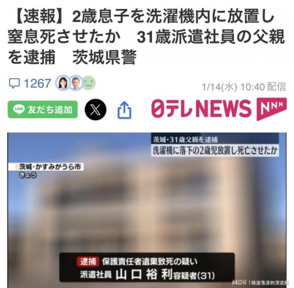 据日媒报道称,一名31岁的父亲因于去年4月,在日本茨城县霞浦市一公寓内将其2岁儿子遗留在洗衣机后致其窒息死亡而被逮捕。